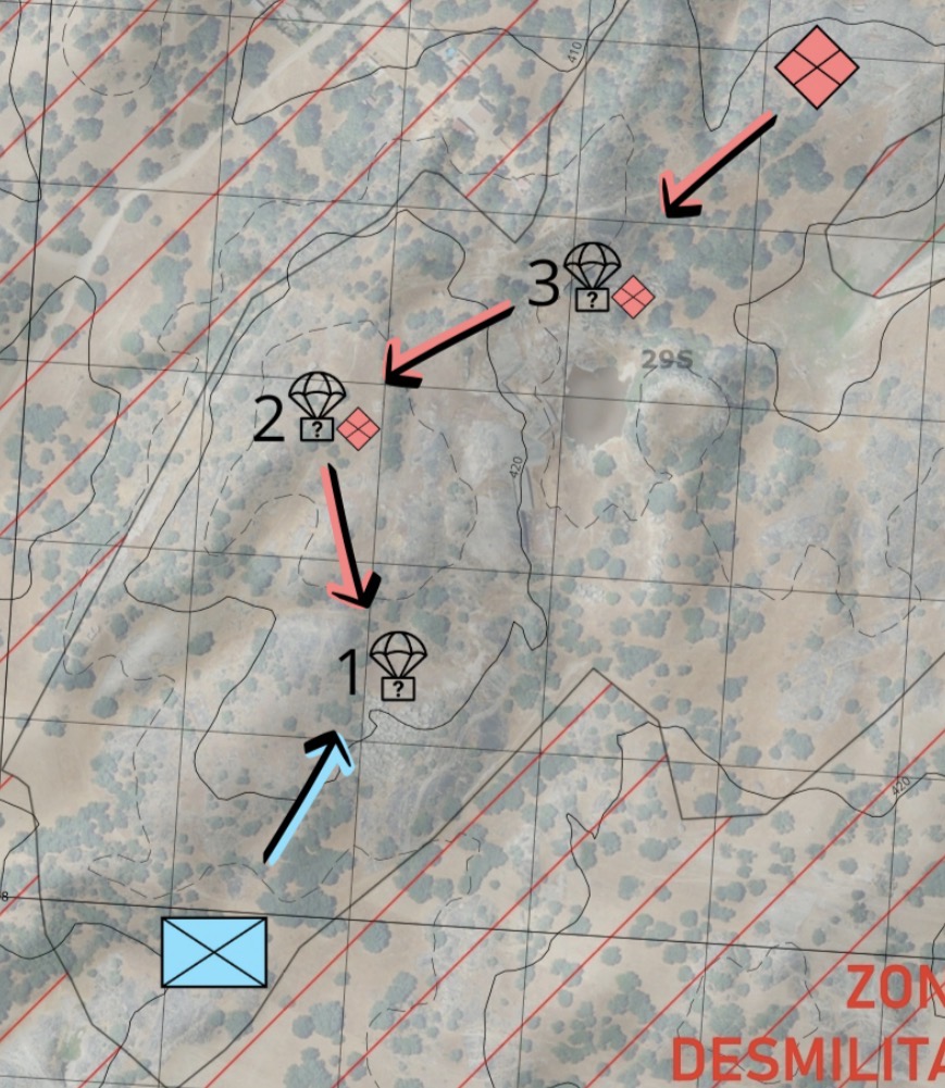 A primeras horas de la madrugada, las estaciones de vigilancia han detectado un eco en radar no identificado que ha sobrevolado la línea de frente a gran velocidad. Minutos después, sensores terrestres confirmaron la caída de múltiples bultos en paracaídas sobre la cuadrícula Bravo Tango 3310.