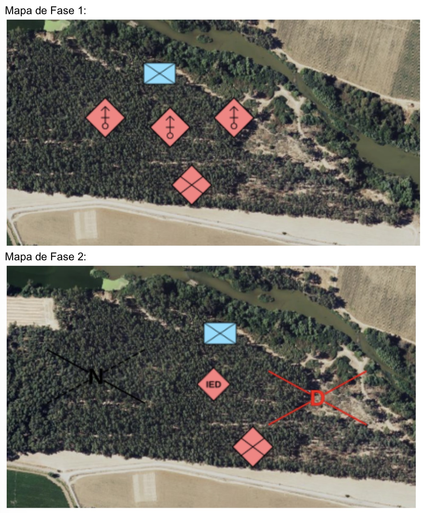Fase 2: Destrucción de IEDs: Ambos equipos buscarán un IED de alta potencia oculto en el bosque, el bando Iraní intentará detonarlo para causar más daños en la zona objetivo. La misión será neutralizar el IED a toda costa.